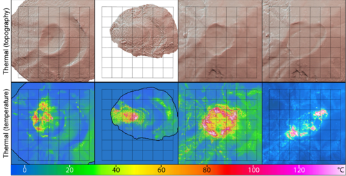 熱成像技術也廣泛用于監(jiān)測目的,因為它們可以定量評估火山噴口的熱通量,圓頂,流量和噴氣孔。重要的是,熱通量的空間分布可以揭示難以用反射可見光檢測到的特征,例如噴氣孔,裂縫和落石痕跡。熱異常的分布和強度的變化也可以先于火山噴發(fā)或噴發(fā)形式的變化,因此有可能進行災害預報。
