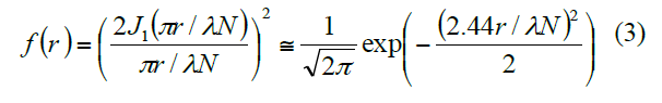 我們正在測(cè)量一個(gè)比距離 D 小的器件寬度。因此,這是一個(gè)亞衍射極限特征。這個(gè)系數(shù)來(lái)自于從點(diǎn)源發(fā)出的能量譜作為距離的函數(shù)。圖6中的艾里盤(pán)確定了能量譜在貝塞爾函數(shù)輪廓中為零的距離極限,這是以點(diǎn)源為中心的距離函數(shù) [9]。這個(gè)能量輪廓在艾里盤(pán)內(nèi)可以用高斯輪廓近似擬合,其系數(shù)為 2.44,這便于進(jìn)一步的數(shù)學(xué)處理。從點(diǎn)源沿距離的能量譜可以描述為: