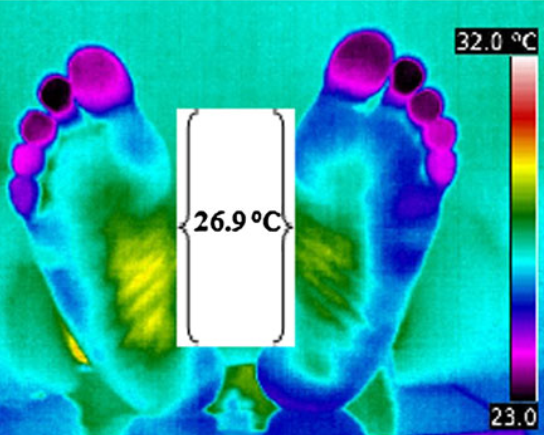 在糖尿病組中,平均皮膚溫度低于正常區(qū)域的身體部位,隨著HbA1c升高,皮膚溫度降低。與HbA1c相比,紅外熱成像顯示的皮膚溫度可以在早期發(fā)現(xiàn)糖尿病。皮膚溫度下降可能是由于基礎(chǔ)代謝率下降,血液灌注不良和胰島素抵抗高所致。足部熱像圖提供的早期體征可以用作檢測(cè)正在發(fā)展為糖尿病受試者的個(gè)體和處于疾病早期階段的個(gè)體潰瘍的有效預(yù)后工具。影響下肢的并發(fā)癥是糖尿病最常見的表現(xiàn),嚴(yán)重可能會(huì)導(dǎo)致截肢。而紅外成像可提供精確的截肢水平,從而避免了常規(guī)方法中的截肢。