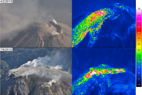 研究者監(jiān)測了始于2013年1月的火山穹頂,當時熔巖噴發(fā)形成了一個150毫米寬和50毫米深的火山口底部(同月發(fā)生了幾次大爆炸)。 新的圓頂繼續(xù)充滿了這個火山口,到2013年4月,溢流形成了幾個熔巖流,并最終充滿了整個山頂火山口(寬約300 m)。 2015年7月10日至11日,幾次局部坍塌(伴隨火山活動增加)導致穹頂破壞; 這些坍塌產(chǎn)生的火山碎屑密度流沿著蒙特格蘭德的山溝傳播了約10.6公里,威脅了幾家牧場和克薩里亞鎮(zhèn)(2010年人口8611)。 自1913年以來,該火山噴發(fā)是沃爾坎德科利馬州最大的火山噴發(fā)。